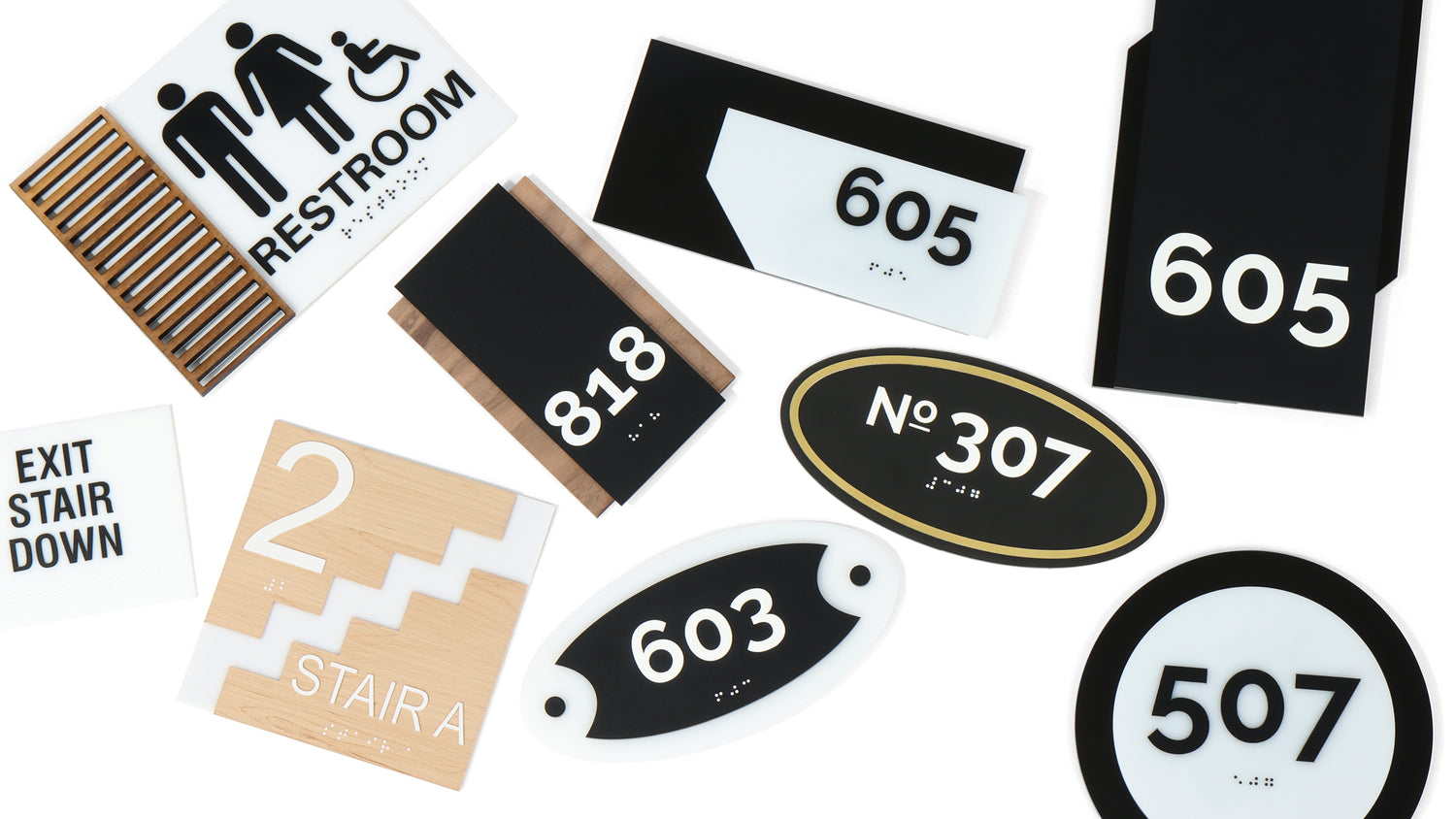 Matte Black Acrylic on Walnut Wood. Available in many colors and wood type. ADA Compliant